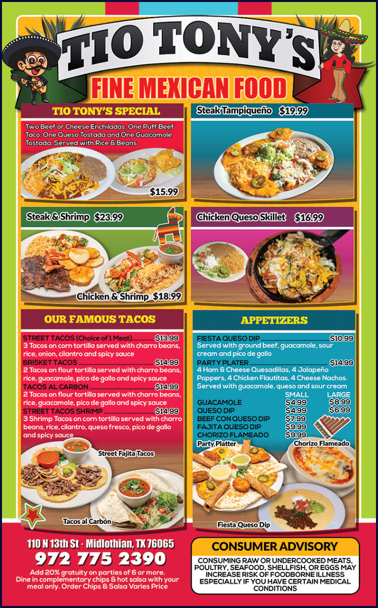 TIO TONY’S FINE MEXICAN FOOD 110 N. 13th St Midlothian, TX 76065 972-775-2390